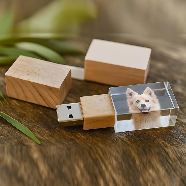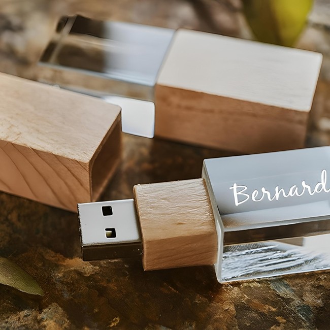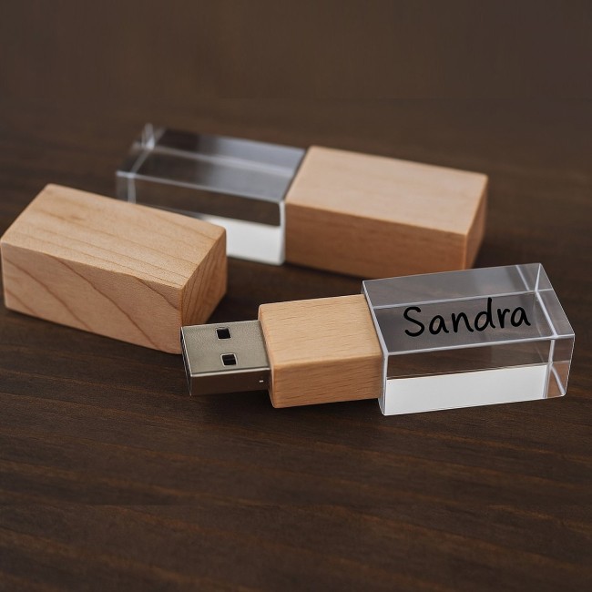 Deze USB stick met naam bestaat uit een duurzame glazen body (65x20x15 mm) en een natuurlijke maple houten dop. Het geheel weegt slechts 35 gram, waardoor het licht en gemakkelijk mee te nemen is. De glazen afwerking zorgt niet alleen voor een strakke look, maar maakt het ook mogelijk om jouw ontwerp – zoals een naam, logo, foto of korte tekst – helder en precies te graveren of te printen.